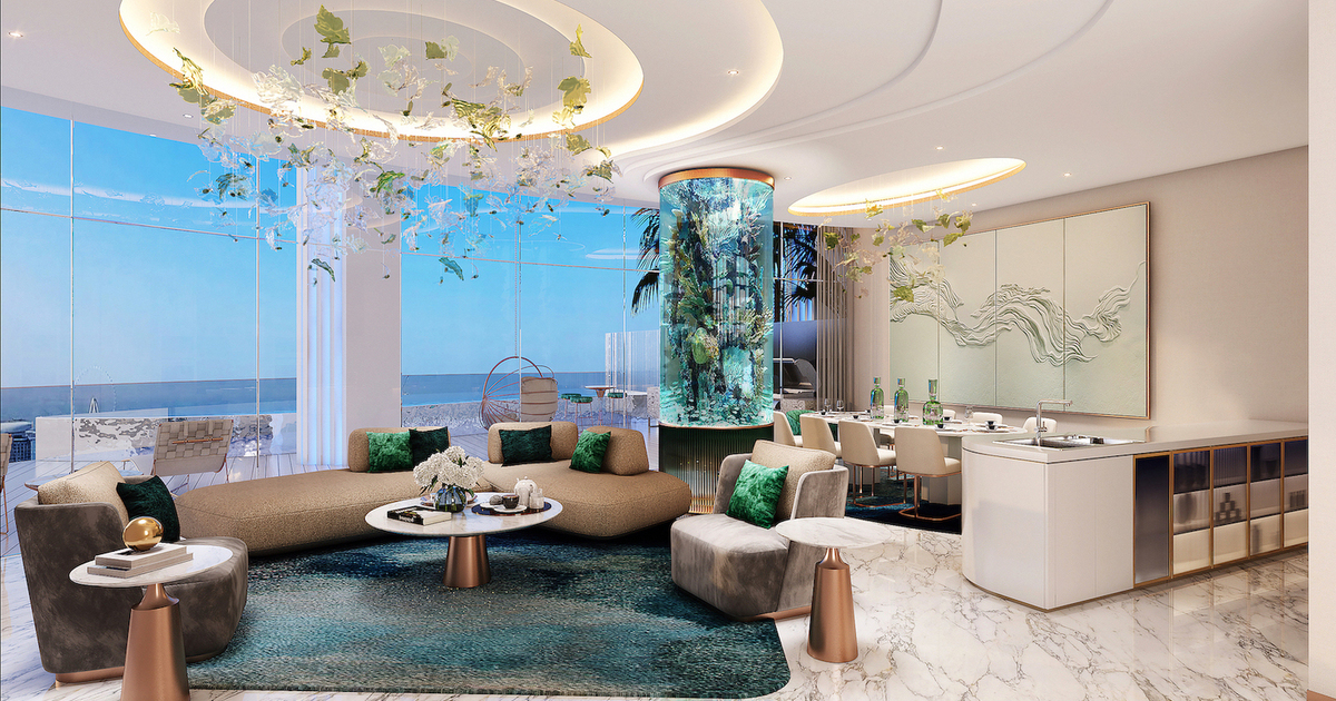 The project is a perfect combination of city and island life. As soon as you arrive, you will be dazzled by the calm and refreshing atmosphere of tropical palm trees and water. From reflective surfaces to fluid patterns and ethereal accents, interiors are transformed into a tropical paradise with waterfalls, lakes and oversized aquariums full of aquatic creatures.