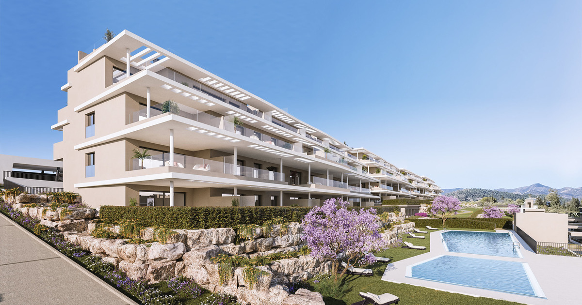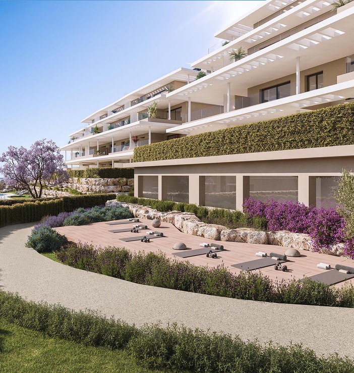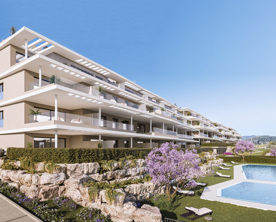 Residential project in the sought-after area of the New Golden Mile between Estepona and Marbella, adjacent to La Resina Golf Club in southern Spain. East- and west-facing apartments with 2 or 3-room layouts offer spacious terraces and sun-drenched front gardens with a view of the surrounding countryside. Prices from EUR 380,000.
