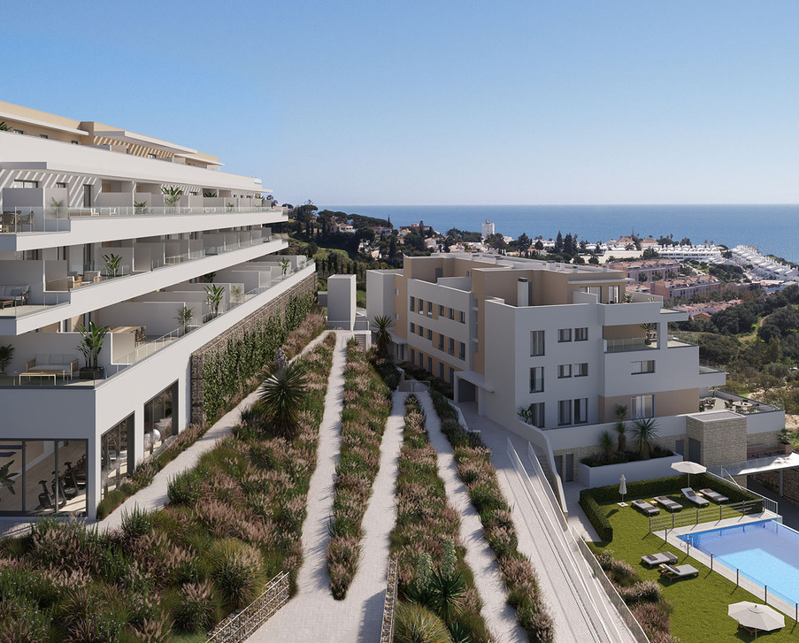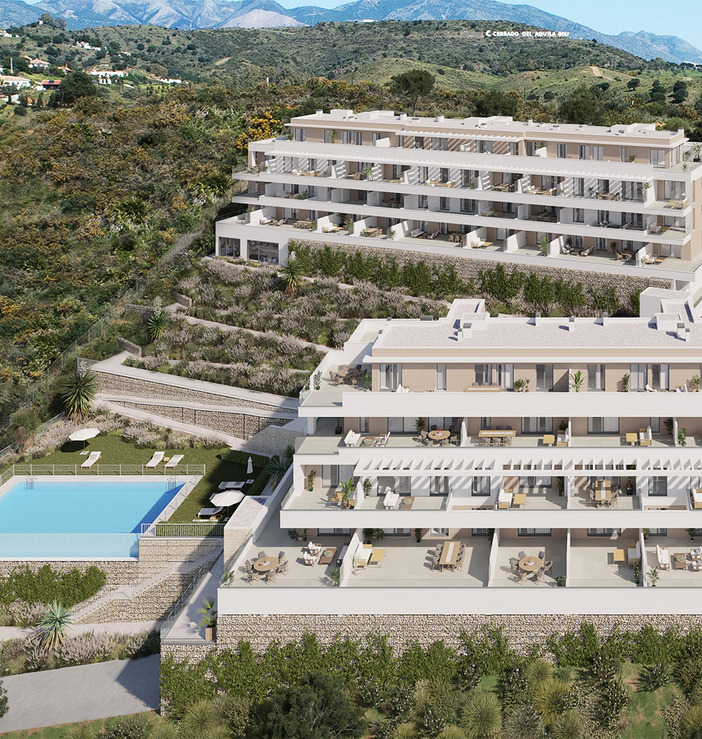 New modern residential project on the coast of southern Spain in the prestigious area of La Cala de Mijas. A total of 48 apartments with 2- and 3-bedroom layouts in two four-story buildings will offer unique views of the Mediterranean Sea thanks to its hillside location and southern orientation. Prices from EUR 409,000.The project is being developed as a private complex with manicured gardens covered with mature greenery with a community pool and gym. Standards include ceramic floors, large windows, air conditioning, security doors and fully equipped kitchens and bathrooms. There is also a garage parking space and a cellar for each apartment.