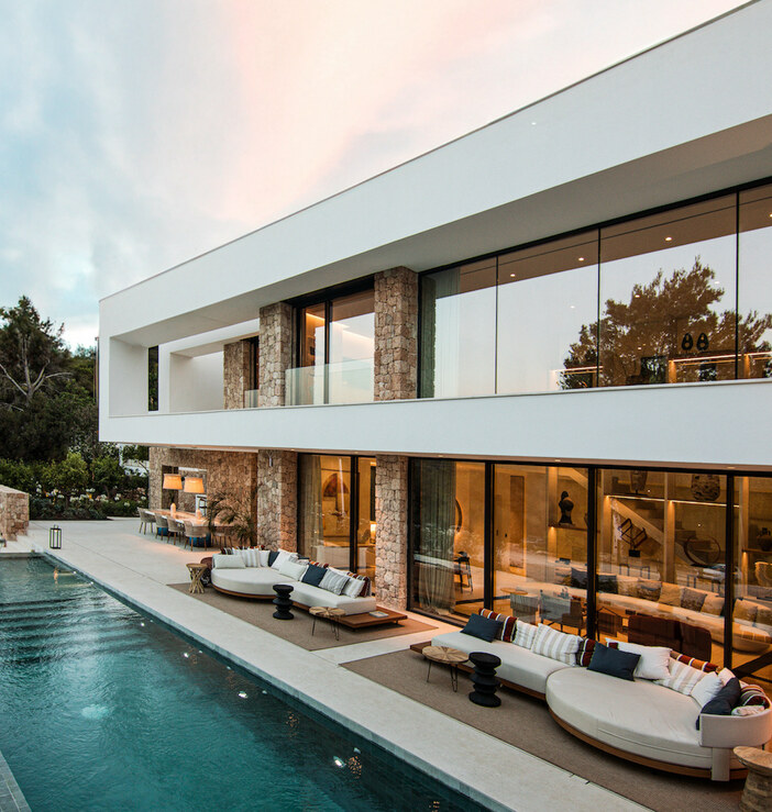 Элегантный архитектурный проект характеризуется чистыми линиями и несравненным мастерством исполнения с типичным для Средиземноморья сочетанием камня и белого цвета. Великолепные интерьеры, наполненные светом благодаря окнам от пола до потолка, частным бассейнам и уникальному дизайну с вниманием к деталям, прекрасно дополняют идиллическую атмосферу Ибицы. Конфиденциальность, индивидуальная отделка и высококачественные материалы — это само собой разумеющееся.